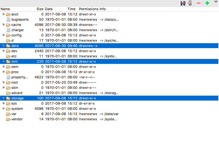 上图就是Android文件的结构图了,这里给大家介绍一下/data、/mnt、/storage这三个文件夹(因为这涉及到我们接下来的内容),/data这个文件夹下中有一个app文件夹是用来存放我们安装应用的apk文件的,同时下面还有一个data目录这个就是我们的内部存储空间了(sharedpreference、数据库文件等都是存在这里的),不同的应用用以包命名的文件夹作区分。mnt和storage就是我们的外部存储空间了,mnt下只是一个storage的链接,真正空间位置还是storage。